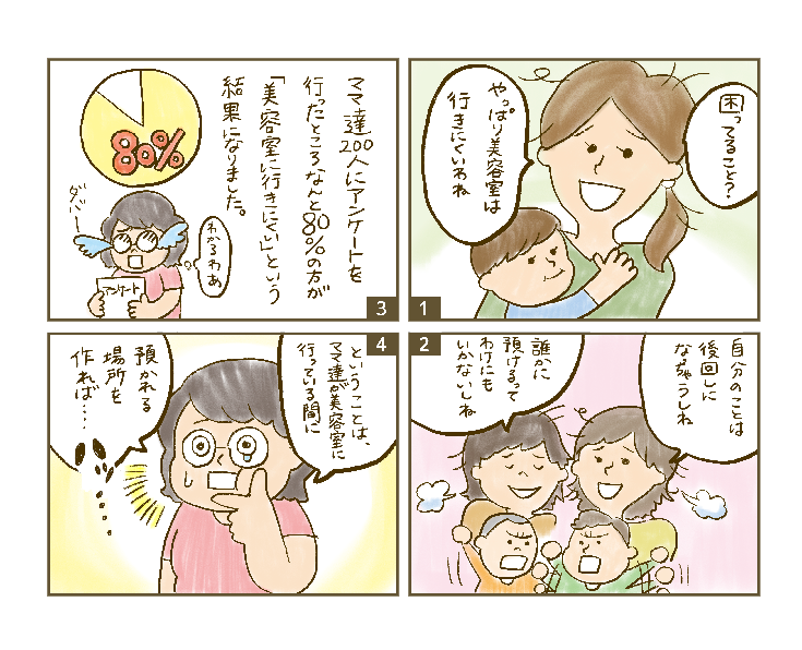 アンケートを受けて、「美容室」に狙いを定めた私たち。すると、運良く1店舗目で「あなたたち、面白そうね。うちのビルが空いているから、貸してあげるわ」という美容室オーナーに出会えました。無事に店舗も決まり、時間制託児ルーム「キッズパオ」が誕生したのです。