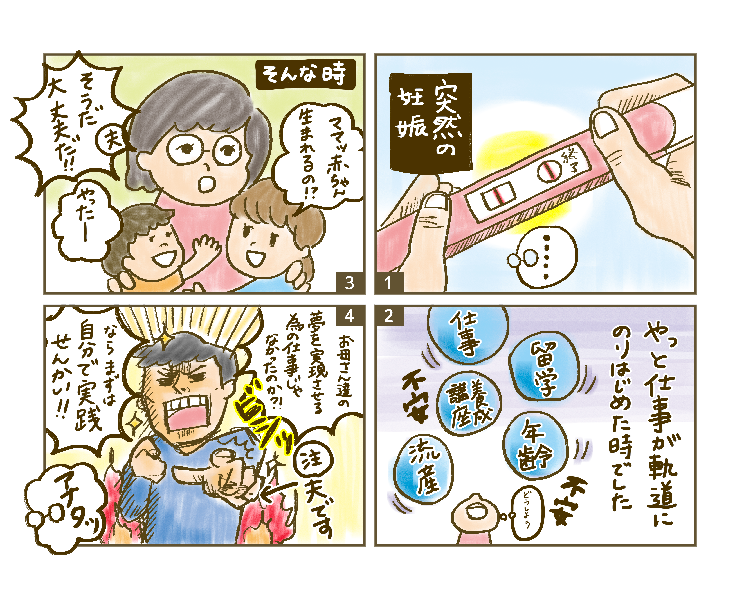 仕事が軌道に乗り始めた頃、妊娠が発覚。嬉しい気持ちよりも先に、目の前が真っ白に。ベビーシッターの養成講座や研修会など、大きな仕事を引き受けたばかりだったのです。さらに、ドイツ留学も控えていました。「今、休むわけには・・・」「36歳という年齢もある・・・」。