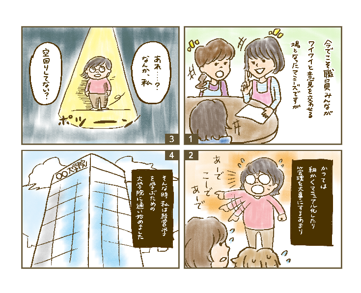 一緒に働く人が増えてくると、時々もっと自主的に動いてほしいと感じることも。そんな折、大学院での学びでダニエル・キム博士の「成功循環モデル」を知りました。想いを押し付けすぎてしまうと、社員は自ら動かなくなってしまう・・・保育と同じだと腑に落ちました。