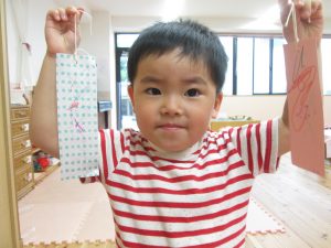 キッズパオあおぞら園ブログ 2019.07.08 ☆七夕☆ 「短冊書けたよ♪」 「私の笹飾りどう?」 短冊を書いたり 手伝ってもらいながらのりを使い輪飾りを作ったり・・。 みんなの願い事が叶いますように・・。 過去のブログ 2019.07.08水遊び 始まりました♪ 2019.07.08☆七夕☆ 2019.07.08水遊びをしました♪