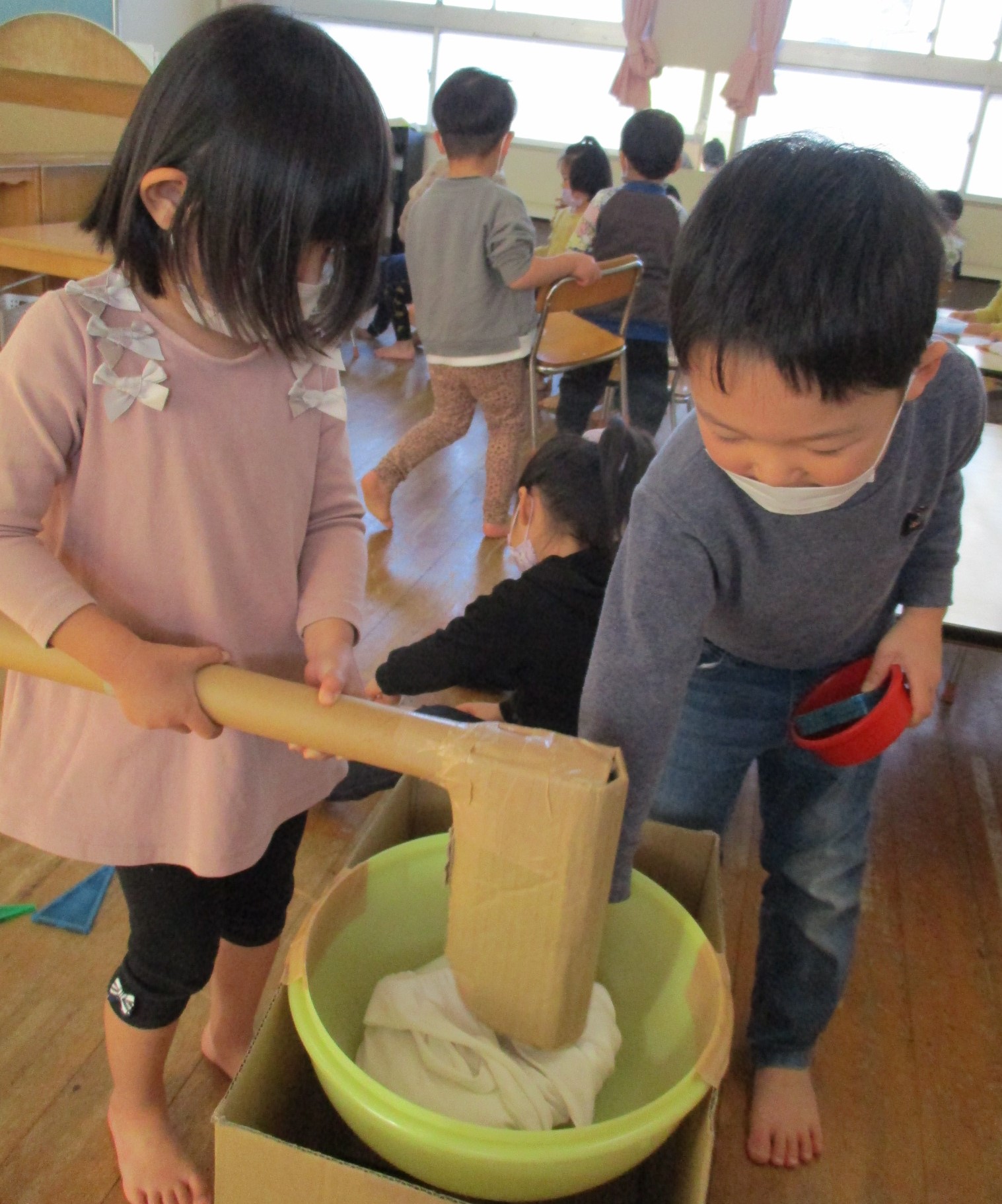 子どもたちは、手作りの杵と臼を使って遊んでいます。