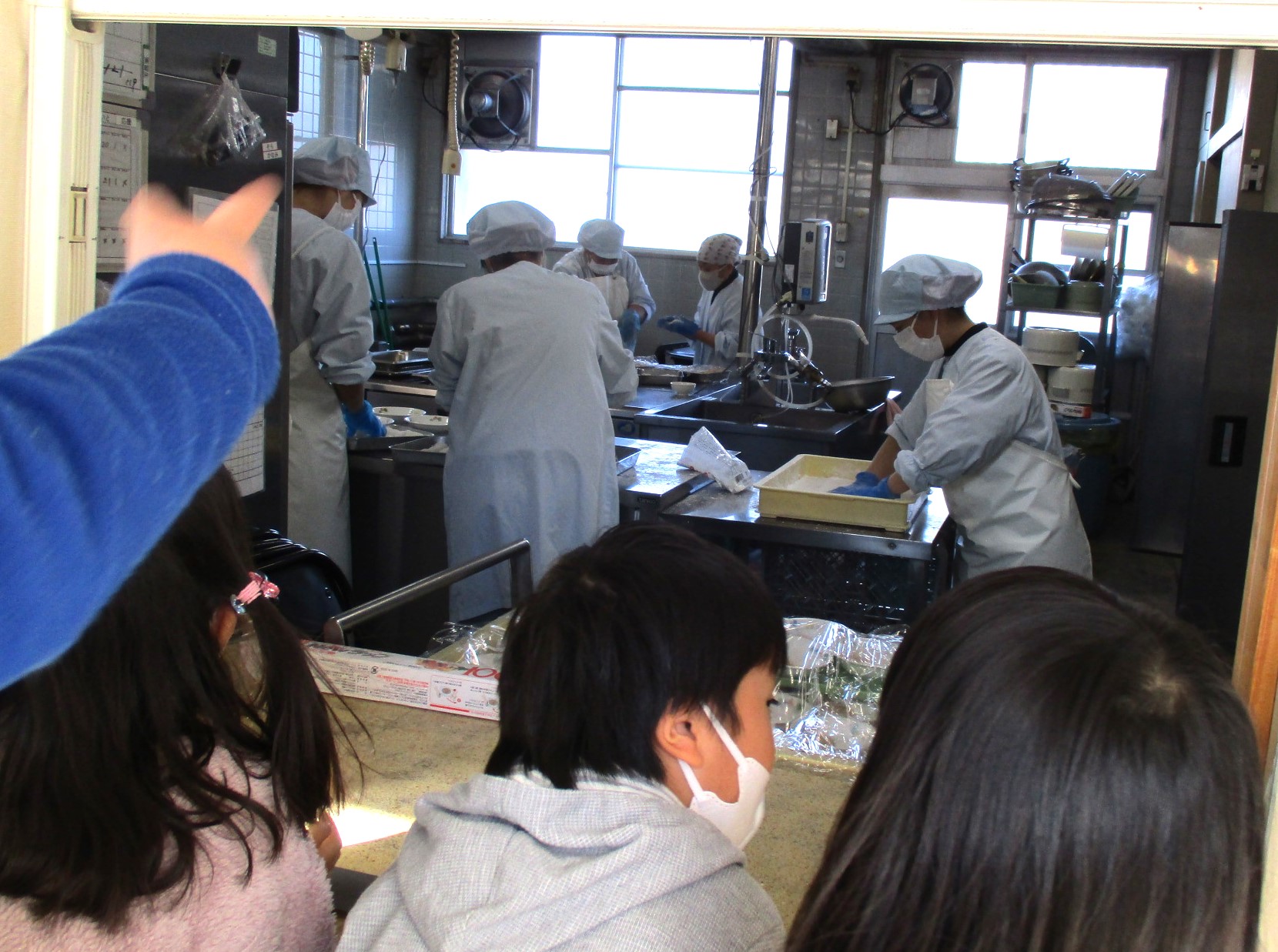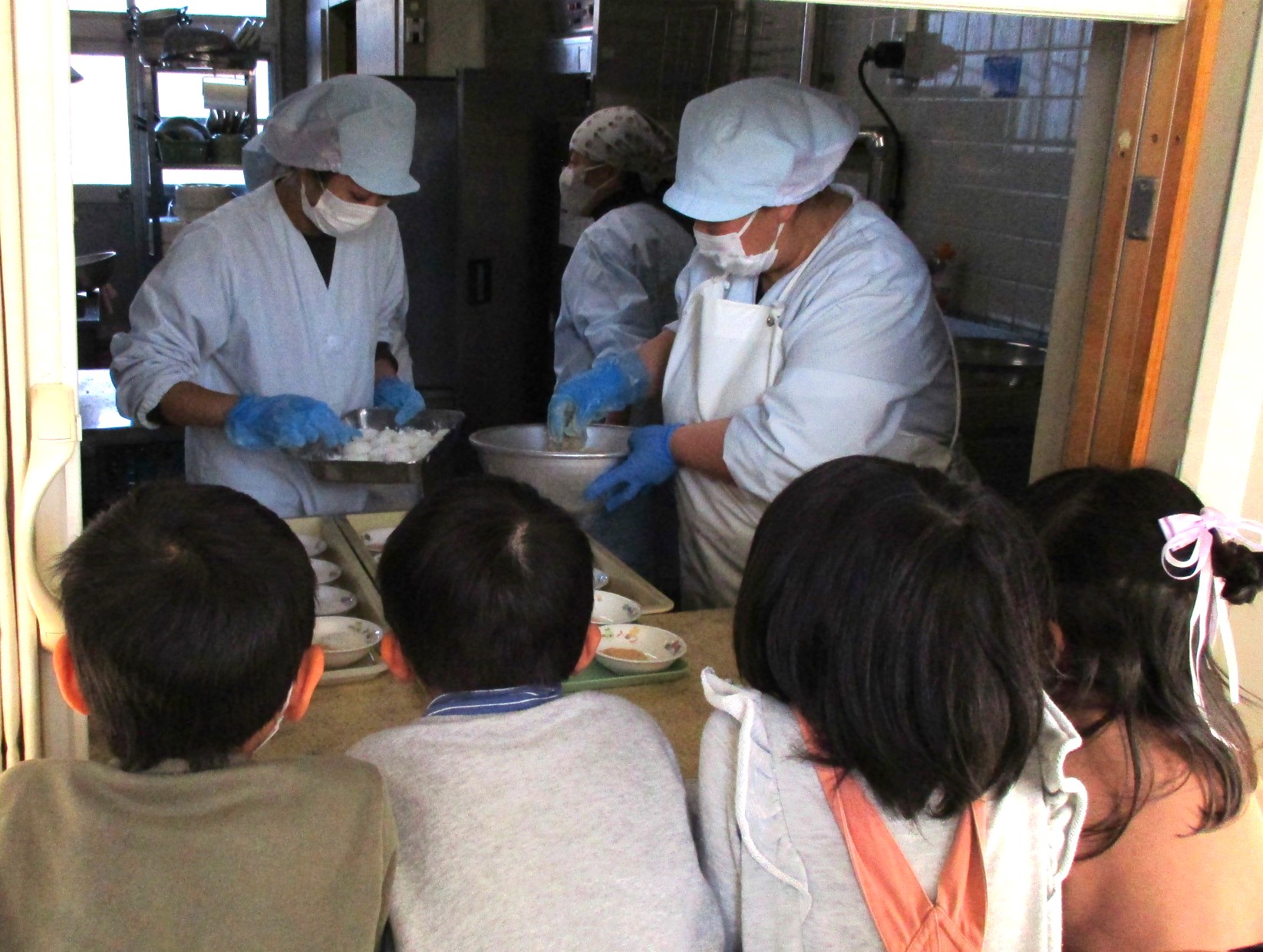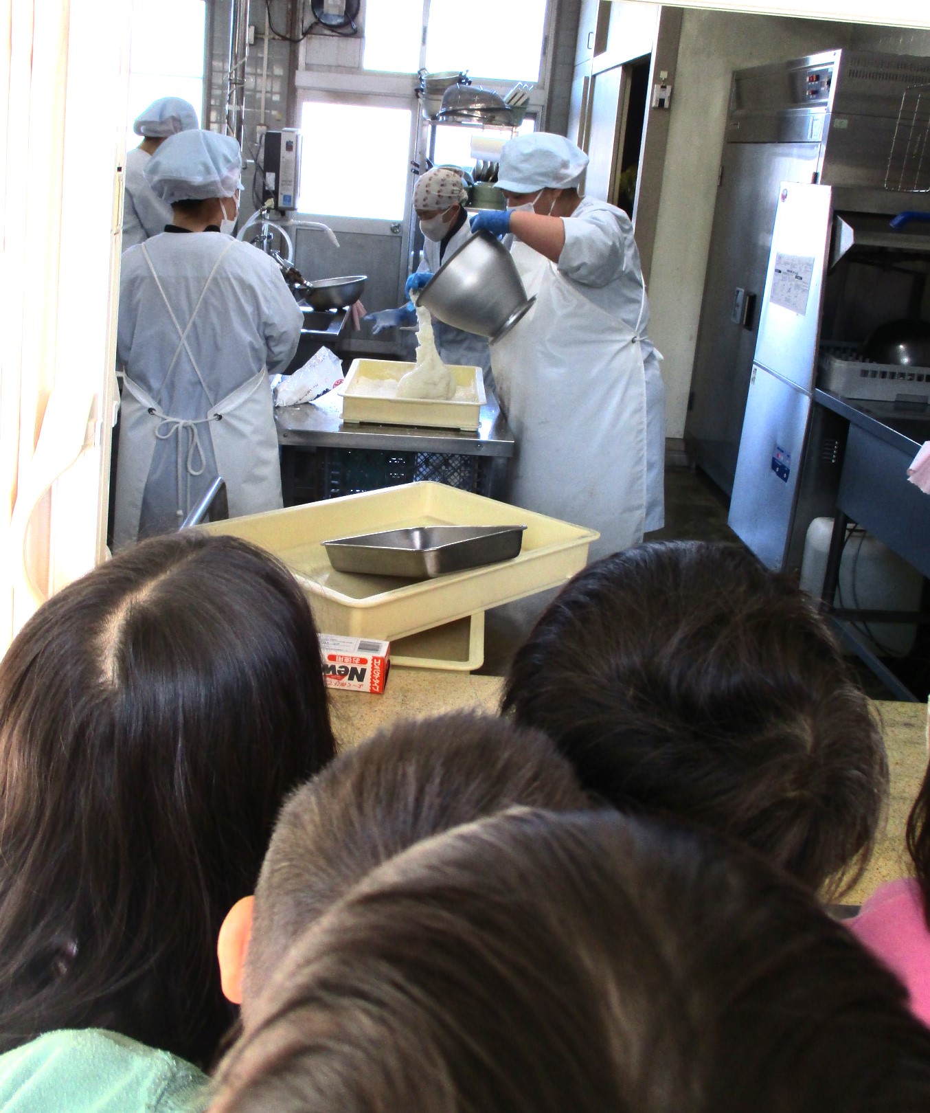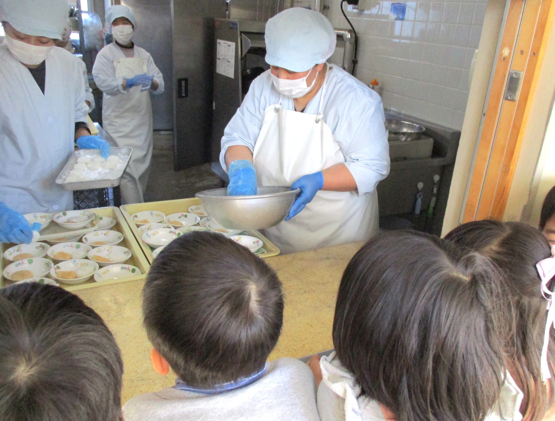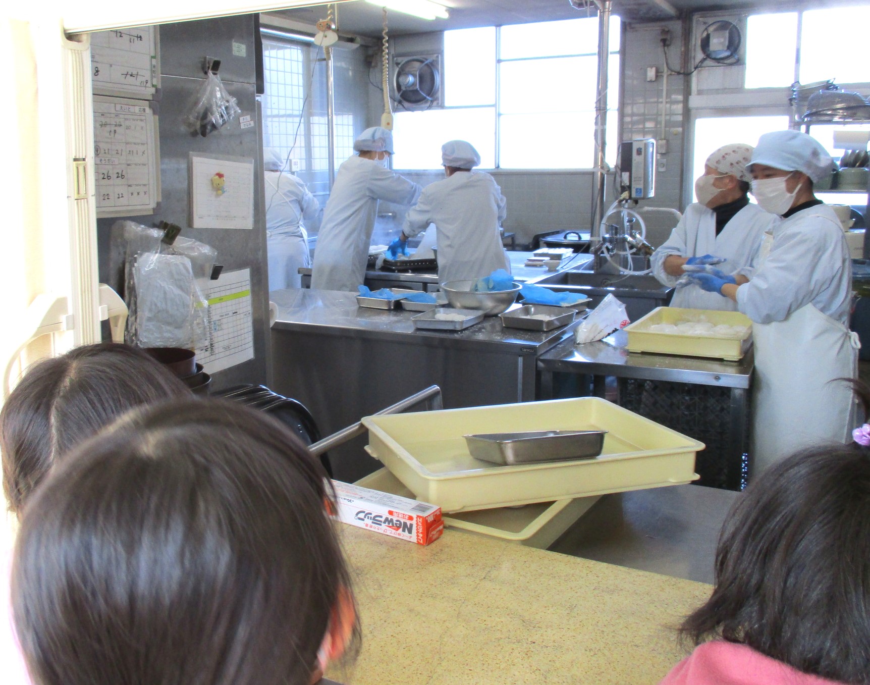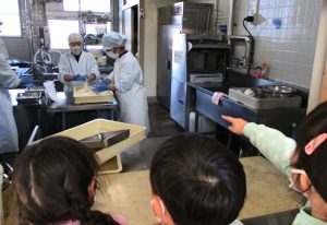 そら組の子たちは、調理室でのおもち作りの様子を見せてもらいました。