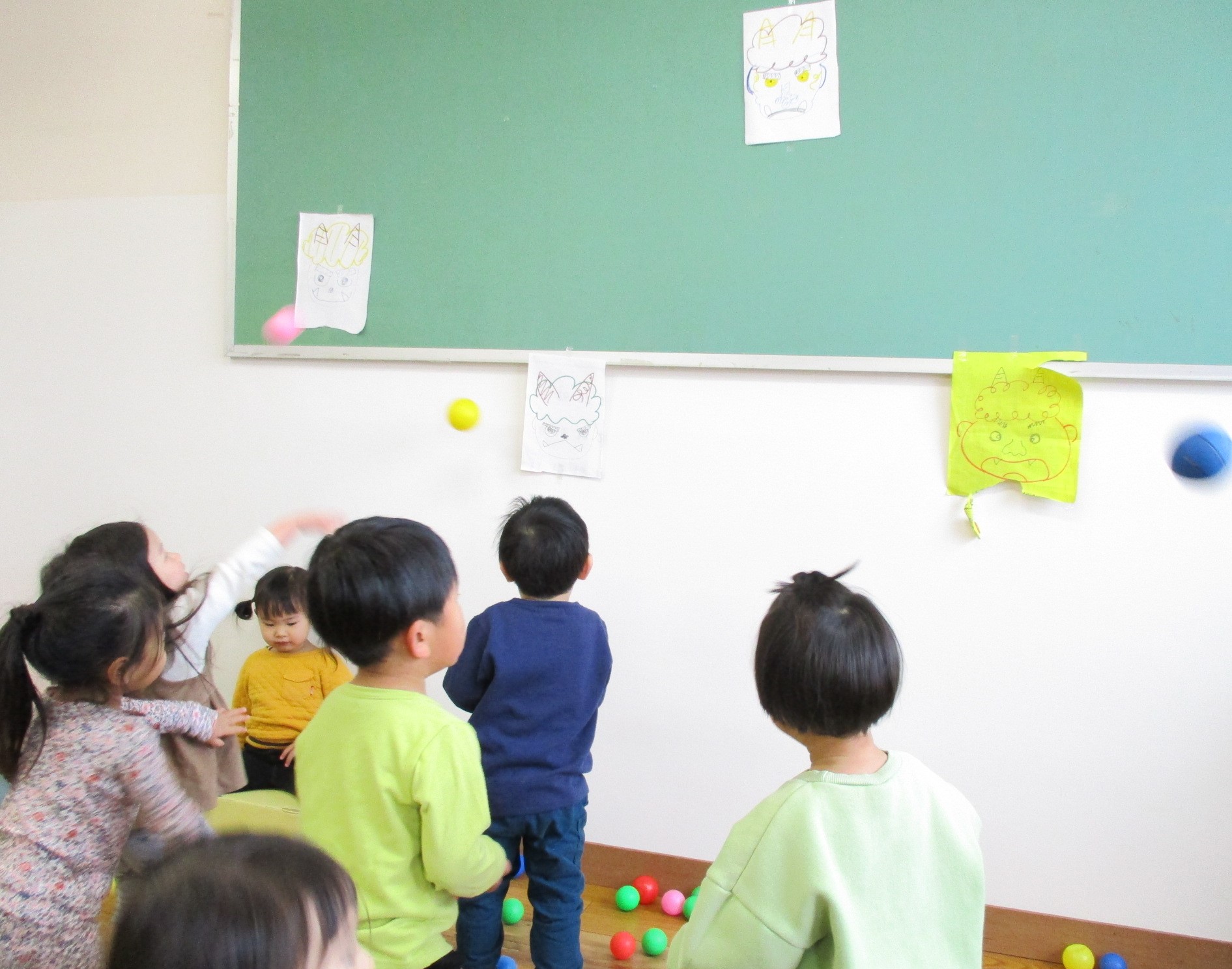 豆まきごっこで、鬼の絵に向けて「鬼はそと~!」と投げたり・・・
