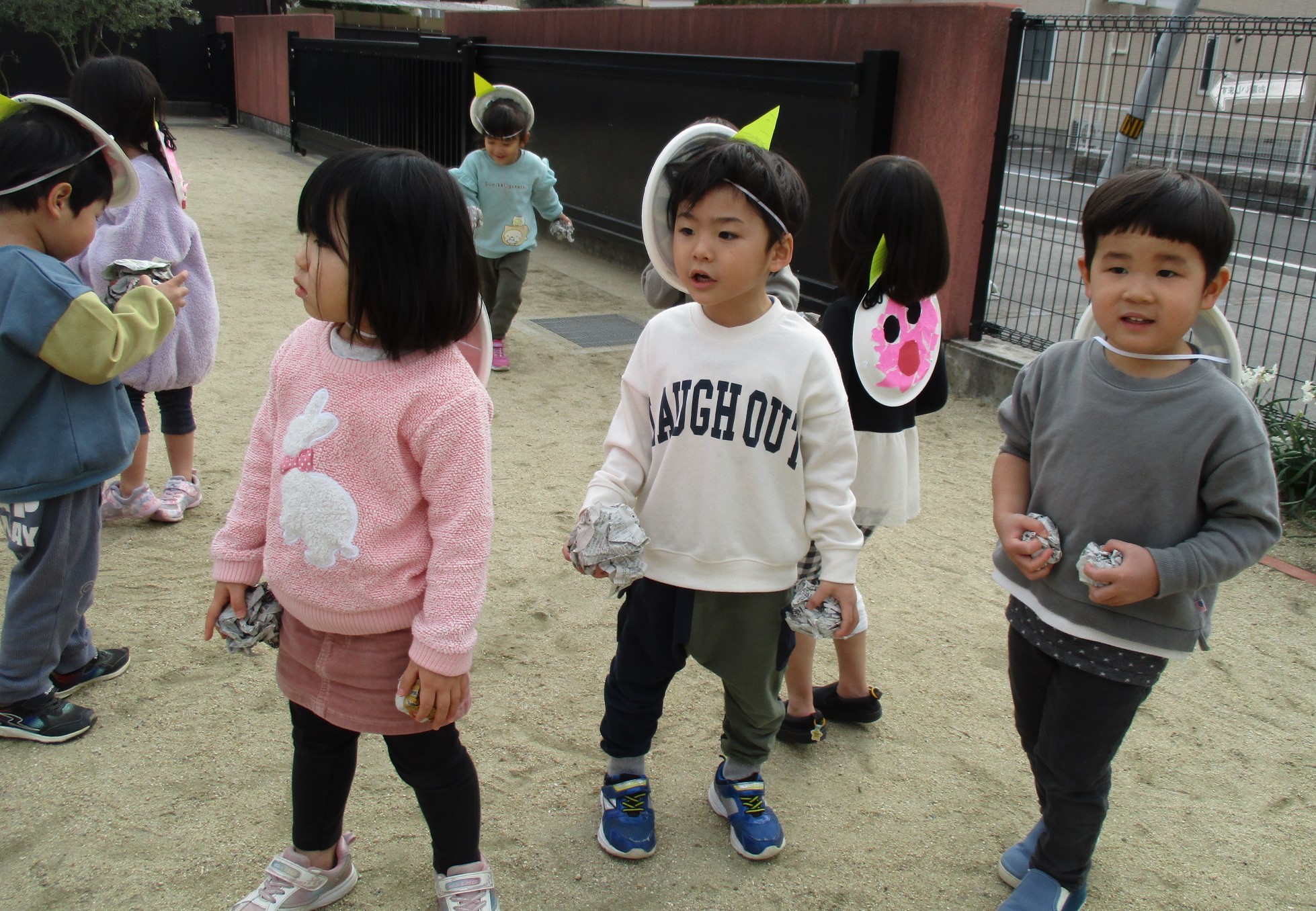 クラスで楽しんだ後は、みんなで園庭に出て豆まきです!